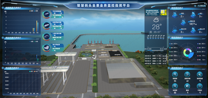 航通智能主要承擔(dān)信息化系統(tǒng)包括海關(guān)、邊檢、海事信息化系統(tǒng)相應(yīng)軟硬件設(shè)施設(shè)備,以及符合海關(guān)監(jiān)管要求和前詹作業(yè)區(qū)通用碼頭業(yè)務(wù)發(fā)展需要的聯(lián)網(wǎng)監(jiān)管平臺(tái)及配套系統(tǒng)。公司對(duì)標(biāo)全國一流碼頭作業(yè)區(qū)口岸基礎(chǔ)設(shè)施信息化建設(shè)標(biāo)準(zhǔn),充分運(yùn)用物聯(lián)網(wǎng)、大數(shù)據(jù)、人工智能、數(shù)字孿生、3D模型等前沿科技,并引入智慧碼頭全景業(yè)務(wù)指揮監(jiān)控平臺(tái),通過平臺(tái)與碼頭作業(yè)系統(tǒng)對(duì)接,抽取碼頭內(nèi)外貿(mào)貨物的作業(yè)數(shù)據(jù),結(jié)合可視化智能大數(shù)據(jù)展示功能,實(shí)現(xiàn)獲取船舶抵錨、靠泊離港作業(yè)動(dòng)態(tài),并對(duì)內(nèi)外貿(mào)貨物進(jìn)出卡口、堆場存取、裝卸船等實(shí)時(shí)、動(dòng)態(tài)管理和全程監(jiān)控,全面提升碼頭作業(yè)全過程可視化監(jiān)管水平和查驗(yàn)全流程智能化管理。
